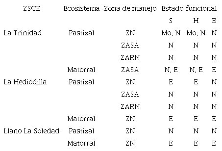 En La Trinidad, la condición del pastizal correspondió a la categoría de nula a ligera en ambas zonas de manejo (Tabla 2). En contraste, la ZN presentó el estado funcional moderado en los dos primeros atributos (Tabla 2); asimismo, los tres atributos obtuvieron la categoría de nula a ligera, lo que indicó que dentro de esta misma zona de manejo existieron dos tipos de condición de salud definidos por la Estabilidad del sito/suelo y la Funcionalidad hidrológica del pastizal. Situación similar ocurrió para el área de matorral (que únicamente estuvo presente en la ZASA), ya que presentó dos estados funcionales en los atributos S y H; no obstante, de manera general, la condición de su salud fue extrema (Tabla 2).