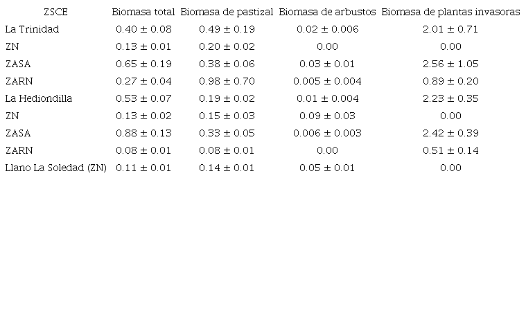 La producción de biomasa de La Trinidad y La Hediondilla estuvo integrada de plantas invasoras, pastizal y matorral natural. Particularmente, la ZN de La Trinidad destacó por presentar únicamente biomasa de pastizal; en contraste, la ZASA, aparte de ser la zona que registró la mayor producción anual de biomasa, tuvo los mayores promedios anuales de biomasa de plantas arbustivas e invasoras. Esto se debió a que en su interior se ha desarrollado con más intensidad la agricultura (Hernández, 2010; Zaragoza-Quintana, 2011), lo que ha generado la formación de considerables parches de vegetación invasora, algunos presentes desde el año 2000 (Zaragoza-Quintana et al., 2012). La ZARN tuvo el mayor promedio anual de biomasa de pastizal debido a que es una zona de aprovechamiento con menos actividades antrópicas, lo que ha dejado una mayor superficie de pastizal nativo (Zaragoza-Quintana, 2011).