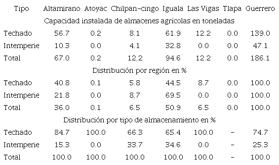 En la Tabla 1 se presenta la distribución espacial de la capacidad instalada de almacenes agrícolas en las distintas regiones del estado de Guerrero. En el año 2019, la capacidad de almacenes agrícola fue de 186.1 mil toneladas; el 74.7% correspondió a bodegas techadas y el restante 25.3% a patios a la intemperie.