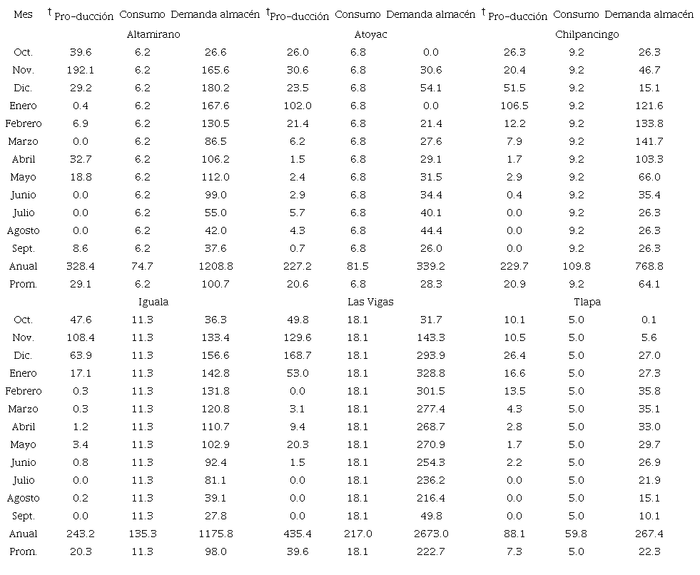 Todas las regiones presentan excesos de demanda de almacenamiento en la mayor parte del año. Atoyac presenta excesos de demanda de noviembre a septiembre, con máximos en julio y agosto por 40 y 44 mil toneladas, respectivamente. Chilpancingo presenta excesos de demanda todo el año, con máximos en marzo por 134 mil toneladas. En las regiones de Altamirano, Las Vigas y Tlapa se han registrado hasta más de ocho meses de excesos de demanda, con máximos en enero y febrero.