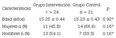 En la presente investigación se incluyeron un total de 45 sujetos, de los cuales 24 conformaron el grupo de intervención y 21 el grupo control, cuya media de edad fue de 15.25 ± 0.44 años en el grupo intervención y 15.23 ± 0.43 años en el grupo control.