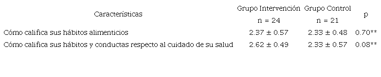 En la Tabla 2 se presentan las características de los participantes en cuanto a la percepción de hábitos alimenticios y conductas respecto al cuidado de su salud antes de la intervención; no se observaron diferencias estadísticamente significativas.