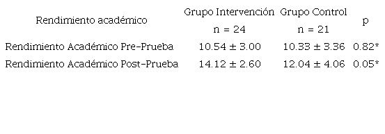 En cuanto a la valoración del rendimiento académico antes de la intervención, no se mostraron diferencias estadísticamente significativas al comparar ambos grupos; sin embargo, el valor del rendimiento académico posterior a la intervención mostró diferencias significativas entre el grupo de intervención (14.12 ± 2.60) y el grupo control (12.04 ± 4.06).