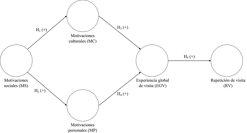 Las motivaciones en festivales se basan en la búsqueda de experiencias específicas (que según la esencia del evento puede ser culturales, gastronómicas, religiosas, espirituales, musicales, deportivas, entre otras), convirtiéndose en expectativas a comprobar, y en caso de que estas se cumplan satisfactoriamente, existirá el deseo de volver (Chang, 2011; Ramesh & Jaunky, 2021). Así, cuando un individuo visita un festival, tiene una experiencia sobre lo que vivió, vio y sintió, juicio que le permitirá tener la intención de repetir, o no, la visita (Kim et al., 2015; Perovic et al., 2018; Tkaczynski et al., 2019; Wan & Chan, 2011). En este sentido, la hipótesis formulada es (Figura 1):