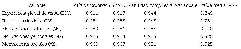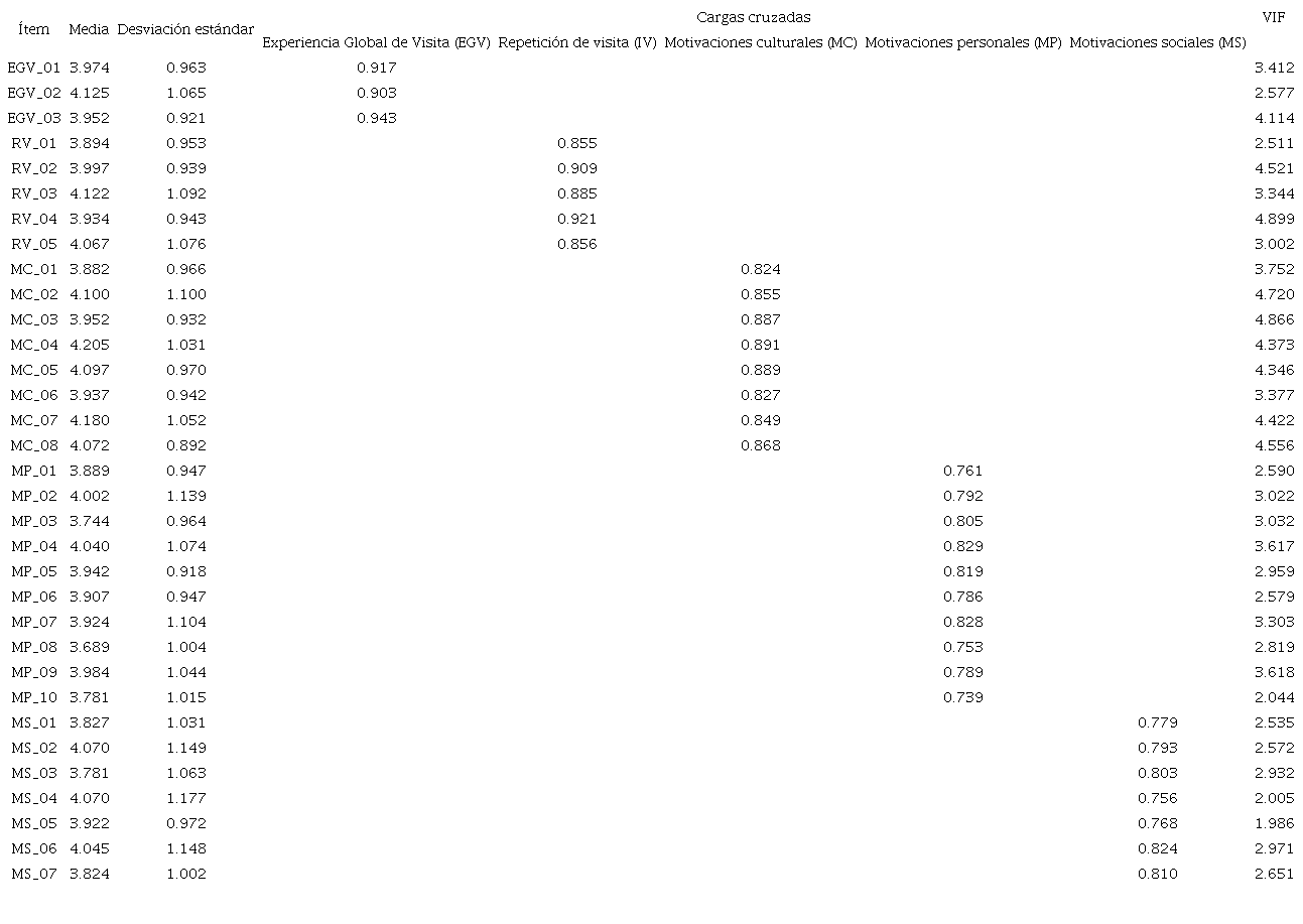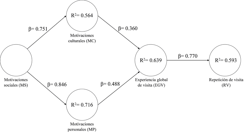En el caso del rol mediador de la experiencia, este se justifica por los efectos indirectos, donde se aprecia que las motivaciones sociales (β = 0.318; p ≤ 0.001; β = 0.208; p ≤ 0.001), culturales (β = 0.277; p ≤ 0.001) y personales (β = 0.376; p ≤ 0.001) tienen impactos indirectos significativos sobre la repetición de visita (Tabla 7), pero con fuerzas menores, en comparación con el valor logrado por la experiencia global (β = 0.770; p ≤ 0.001); al mismo tiempo que esta predice con gran relevancia la intención de una segunda visita en un 60% (R2 = 0.593; Q2 = 0.459; p ≤ 0.001).