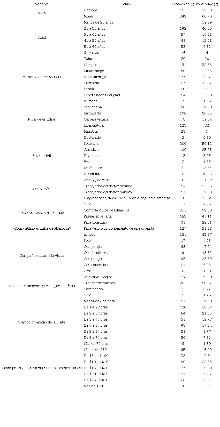 Los participantes fueron mujeres y hombres (jóvenes de 18 a 30 años [59.8%], adultos de 31 a 50 años [26.5%]), residentes cercanos a la ciudad de Toluca, destacando los municipios de Zinacantepec y Metepec del Estado de México, aunque también se observa una afluencia de visitantes de otras entidades del país. En su mayoría son solteros y casados, con niveles educativos de licenciatura, bachillerato y carrera técnica, trabajadores de los sectores privado y público. Respecto a la visita a la Feria del Alfeñique, lo hacen para pasear por el corredor y comprar el dulce, el cual usan para consumo o como ornamento en sus ofrendas del Día de Muertos. Para llegar a la feria, optan por el transporte público y vienen acompañados de familiares. Además, su tiempo de visita es de una a dos horas y tienen gasto promedio de $51 a $200 pesos mexicanos.