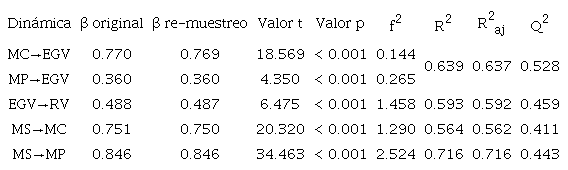 Por otro lado, se recurrió al análisis bootstrapping con un remuestreo a 5000 observaciones (Dijkstra & Henseler, 2015), y se verificó que los valores t y p de los coeficientes betas fueran significativos (t ≥ 1.960; p ≤ 0.001) (Hair et al., 2017); mientras que el tamaño de los efectos fue grande en todos los casos, aspecto suficiente para considerar la validez predictiva del modelo (Cohen, 1998). En el análisis blindfolding, con apoyo del índice de redundancia de valor cruzado (Q2), se cotejó la relevancia predictiva de las variables al tener un valor mayor a 0 (Geisser, 1974) (Tabla 6).