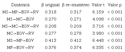 Respecto al modelo estructural, la raíz cuadrada media residual estandarizada (SRMR, por sus siglas en inglés) presentó un valor de 0.076 (criterio de referencia <0.080) (Hu & Bentler, 1998), el índice de ajuste normalizado (NFI, por sus siglas en inglés) fue de 0.904 (criterio de referencia >0.900) (Bentler & Bonett, 1980) y la media cuadrática de la covarianza residual (RMS_theta, por sus siglas en inglés) tuvo un valor de 0.112 (Lohmöller, 1989). En conjunto, estos valores reflejan un buen ajuste del modelo.
