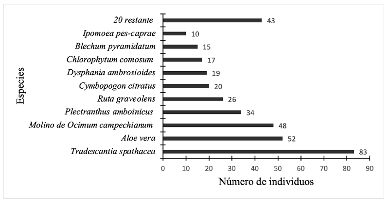 En plantas medicinales se registraron 391 ejemplares de 30 especies pertenecientes a 24 familias. La familia con mayor riqueza fue Asteraceae, con cinco especies. Las especies con mayor presencia fueron Tradescantia spathacea Sw. (22.6%), Aloe vera (L.) Burm.f. (14.1%) y Ocimum campechianum Willd. (13.0%) (Figura 1).