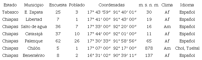 El estudio se realizó en 50 comunidades distribuidas en los municipios Libertad, Salto de Agua, Catazajá, Palenque, Chilón y Benemérito, pertenecientes a la región Maya XIII del estado de Chiapas y en el municipio de Emiliano Zapata del estado de Tabasco, México (Tabla 1). La selección de las comunidades se realizó bajo el muestreo no probabilístico accidental o consecutivo (Otzen & Manterola, 2017), basado en la similitud de los sitios en cuanto al ambiente físico y social (Centro de Información y Estadística de Chiapas, 2012; INEGI, 2000).