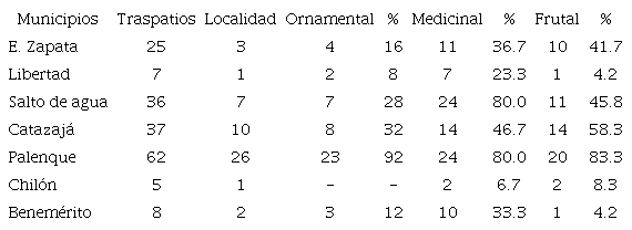 Los resultados obtenidos muestran que la mayor diversidad de plantas de traspatio fue registrada en el municipio de Palenque, Chiapas, probablemente por relacionarse con el Parque Nacional y la zona arqueológica, los cuales pueden estar influyendo en la conservación de especies, con alguna utilidad en los hogares (Gómez-Domínguez et al. 2015); además de interactuar en la cultura ambiental de la población y su comportamiento en las viviendas, sobre todo por la importancia económica, medicinal y ecológica, al existir un valor de uso relevante (Sotelo-Barrera et al. 2017). La riqueza y abundancia de especies registradas en los traspatios muestreados sugiere que estos espacios proporcionan los bienes y servicios necesarios para satisfacer necesidades de consumo y aplicación de principios culturales. La información obtenida de las comunidades estudiadas pone de manifiesto la utilidad de las 30 especies de plantas medicinales identificadas como tratamientos naturales de diversos padecimientos entre los pobladores. En este sentido, los municipios de Salto de Agua y Palenque son los que presentaron el mayor número de ejemplares, derivado de la cercanía a la región XIV Tulijá Tseltal - Chol, al conservar los conocimientos ancestrales y considerar “una relación cultural directa con la flora y vegetación, lo que permite la conservación de la diversidad biológica” y su uso medicinal (Durán-Fernández et al. 2016).
