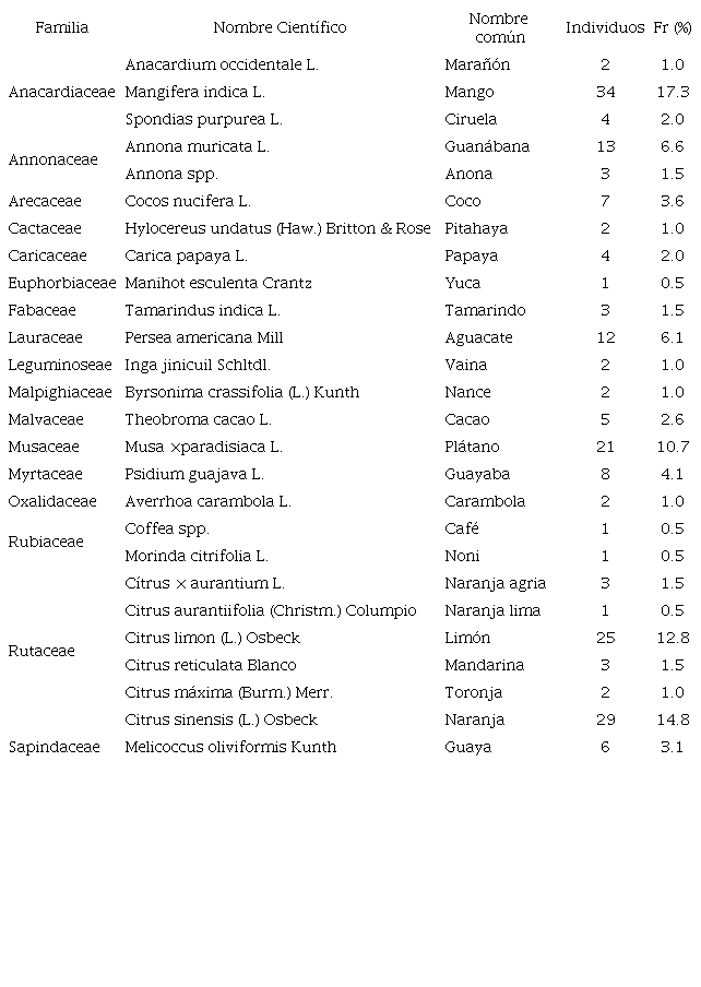 Los frutales encontrados en el traspatio se registraron 114 ejemplares de 26 especies pertenecientes a 20 familias, las familias con mayor presencia fueron: Rutaceae, representado por Citrus limon (L.) Osbeck, Citrus reticulata Blanco, Citrus sinensis (L.) Osbeck, Cítrus aurantium L., Citrus aurantiifolia (Christm.) y Citrus máxima (Burm.) Merr. (32.1%); Anacardiaceae, representada por Mangifera indica L. y Anacardium occidentale L. (20.4%); y Musaceae, representada por Musa paradisiaca L. (10.7%). Estas tres familias representan el 63.3% de la riqueza total de los huertos estudiados que proporcionan frutos en el ciclo primavera-verano y ayudan a solventar necesidades de consumo. Las especies con mayor frecuencia fueron M. indica (17.3%), C. sinensis (14.8%), C. limon (12.8%) y M. paradisiaca (10.7%), las cuales constituyen un 55.6% del total de géneros identificados (Tabla 3).