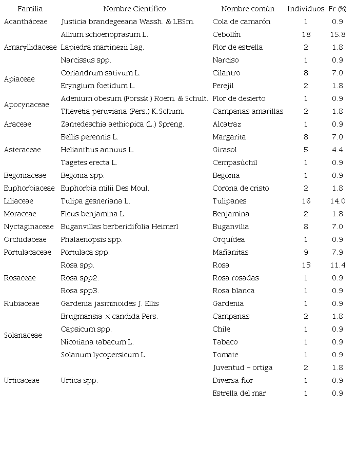En plantas de ornato se registraron 112 ejemplares de 25 especies pertenecientes a 25 familias. Las familias con mayor número de ejemplares fueron Amaryllidaceae, Liliaceae, Asteraceae y Rosaceae. Las especies más frecuentes fueron Allium schoenoprasum L. (15.8%) y Tulipa gesneriana L. (14.0%) (Tabla 4).
