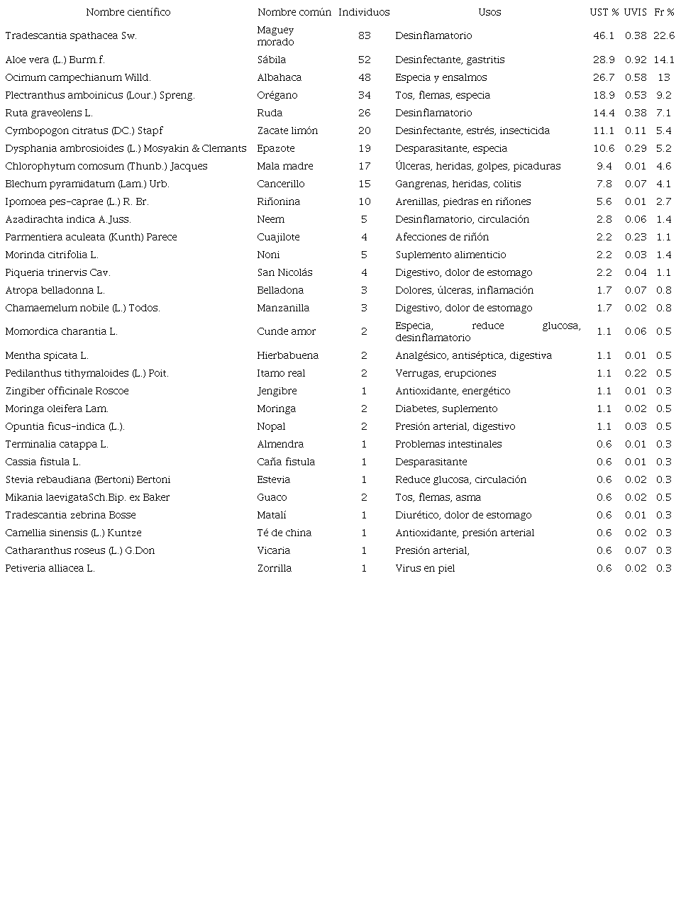 Para la importancia cultural se utilizó el índice de valor de uso (UVIS) de las plantas medicinales A. vera, Ocimum campechianum, P. amboinicus, R. graveolens, T. spathacea y D. ambrosioides mostraron mayor índice de uso en los traspatios. Así mismo, el nivel de uso significativo (UTS %) muestra que las especies con mayor incidencia son T. spathacea, A. vera, Ocimum campechianum, P. amboinicus, R. graveolens, C. citratus, D. ambrosioides y C. comosum (Tabla 5).