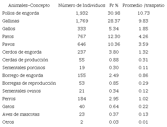 Los animales de traspatio estuvieron representados en su mayoría por aves, con una abundancia total del 82.01%, las cuales se clasificaron de acuerdo con su uso: animales de engorda, gallinas, patos y pavos. Se registró una relación de un gallo por cada diez gallinas, y se identificó que los pollos de engorda presentan la mayor densidad con 10.73 individuos por patio, seguida de las gallinas, patos y pavo, con 9.83, 4.26 y 3.59, respectivamente (Tabla 6).