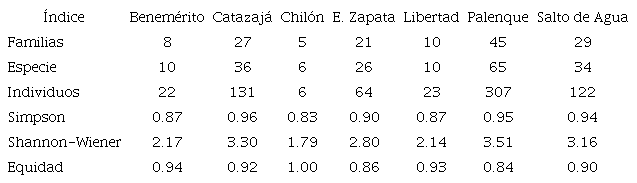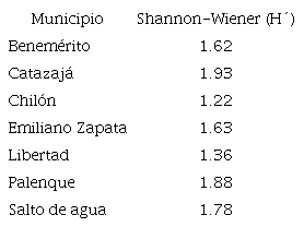 Los índices de diversidad de Shannon-Wiener (H´) y Simpson (S) mostraron que los municipios con el mayor valor de diversidad de plantas de traspatio fueron Palenque, seguido de Catazajá y Salto de Agua. Así mismo, la mayor diversidad de animales de traspatio, de acuerdo con Shannon-Wiener (H´), se registró en Catazajá y Palenque, con 1.93 y 1.88, respectivamente. De acuerdo con el análisis de equidad, la mayor uniformidad de plantas de traspatio se registró en Chilón, seguida de Benemérito, Libertad y Catazajá (Tabla 7 y 8).