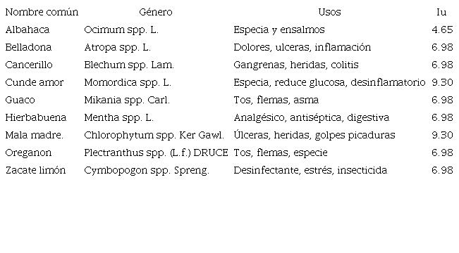 Con respecto al índice de intensidad de uso (Iu), las especies más importantes fueron: Momordica spp., ya que se utiliza como especia, reducción de glucosa y desinflamatorio; Chlorophytum spp., utilizada para ulceras, heridas, golpes y picaduras de mosquito; Atropa spp., utilizada para dolores musculares, ulceras e inflamación; Blechum spp., utilizada para gangrenas, heridas y colitis; Mikania spp., utilizada para la tos, flemas y asma; Mentha spp., utilizada como analgésico, antiséptico y digestivo; Plectranthus spp., utilizada para la tos, flemas y especia; Cymbopogon spp., utilizada como desinfectante, para el estrés e insecticida; y Ocimum spp., utilizada para especia y ensalmos (Tabla 9).