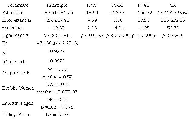 Los resultados del modelo se muestran en la Tabla 1. El R2 ajustado, utilizado como bondad de ajuste, fue de 0.9972, lo que indica que las variables independientes explican en un 99.72% el comportamiento de la variable dependiente.