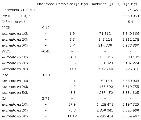 En la Tabla 2 se analizan los efectos de aumentos en 10%, 20% y 30% en el PPCC. Un incremento del 10% en el PPCC, que en 2021 se ubicó en 39 852 pesos por tonelada, disminuiría la QPCP en 180.9 miles de toneladas, lo que representa una disminución del 4.8%.