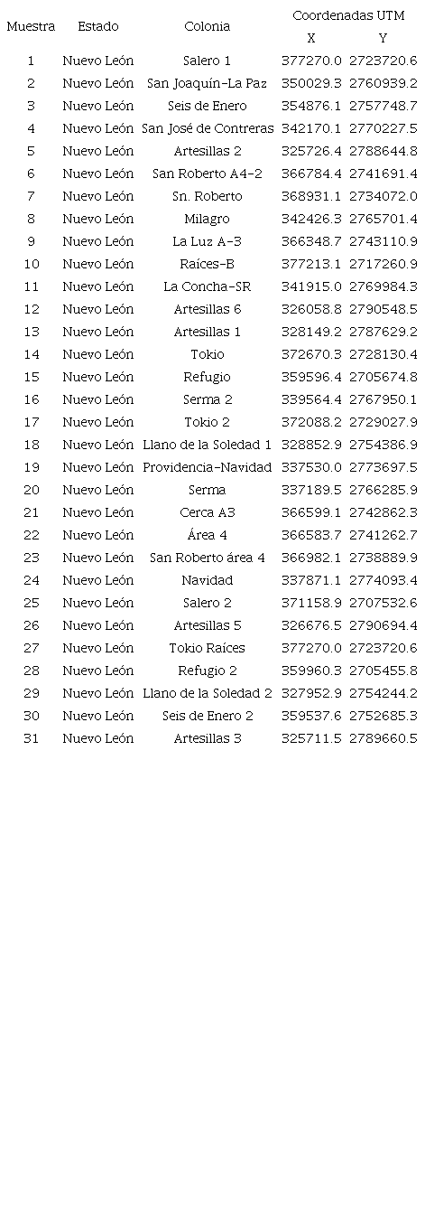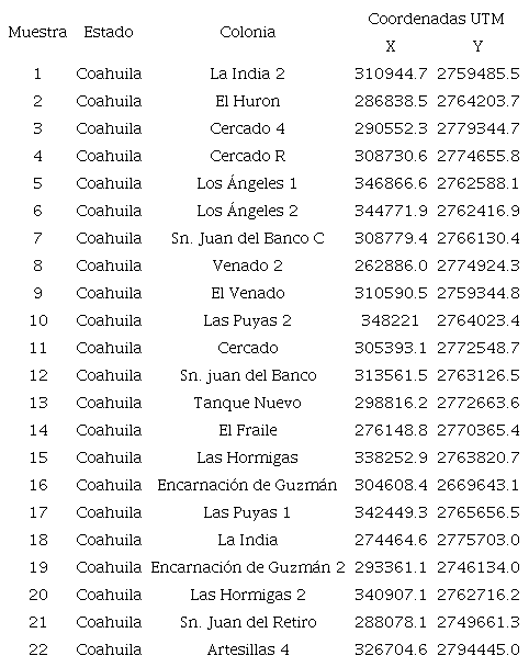 Se muestrearon las colonias del estado de Coahuila y Nuevo León a las que se pudo tener acceso, ya que varias de ellas se encuentran en predios privados a donde no se permite la entrada. En total se obtuvieron 53 muestras de heces de perrito de la pradera, se muestrearon 31 sitios en colonias activas del estado de Nuevo León (Tabla 1) y 22 sitios de colonias activas en el estado de Coahuila (Tabla 2) (Carrera, 2008). La colecta de heces se realizó de forma directa del suelo en las madrigueras (Gallina, 2015), cuidando colectar las heces más frescas con el fin de disminuir el tiempo de contacto con el suelo y disminuir así el contacto que pudiera tener con plaguicidas presentes en suelo. Además, las heces son muy sólidas y secas, por lo que reduce la posibilidad de llevarse una cantidad de suelo significativa. En cada colonia se colectaron submuestras, recorriendo el terreno en forma de zigzag con la intención de abarcar la mayor área posible. Las muestras se guardaron en bolsas de papel para posteriormente transportarlas al laboratorio.