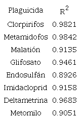 Para la validación del método analítico se realizó una curva de calibración con distintas concentraciones, se inyectaron al HPLC y se obtuvieron las áreas bajo la curva, se graficaron contra las concentraciones y se obtuvo el coeficiente de linealidad (R2) de cada plaguicida. Los resultados de las curvas estuvieron entre 0.8926-0.9842, los cuales se presentan en la siguiente tabla (Tabla 3).