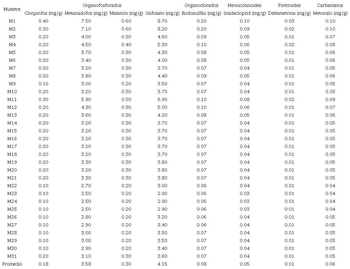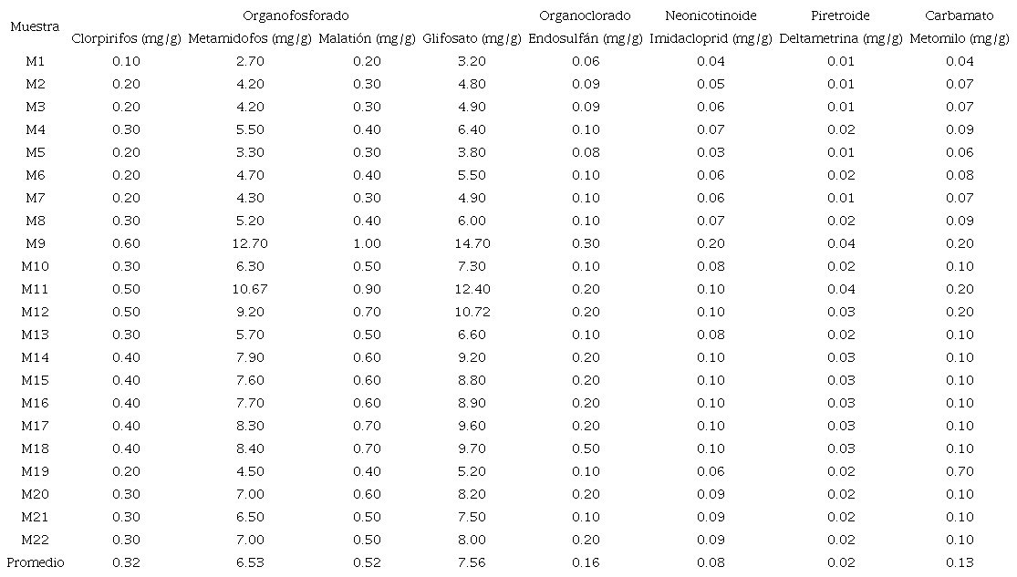Para el estado de Coahuila, en cuanto a los organofosforados, para el clorpirifos se detectaron concentraciones de entre 0.2 mg/g a 0.6 mg/g, con un promedio de 0.33 mg/g. Para el malatión se detectaron concentraciones de entre 0.2 mg/g y 1 mg/g, con un promedio de 0.52 mg/g. Las concentraciones más altas se detectaron en el metamidofos y glifosato; el primero se detectó con concentraciones de entre 2.7 mg/g y 12.7 mg/g, con un promedio de 6.53 mg/g, y el segundo se detectó en concentraciones más altas, desde los 3.2 mg/g a los 14.7 mg/g, con un promedio de 7.56. En cuanto al plaguicida organoclorado, que fue el endosulfán, se detectaron concentraciones de 0.06 mg/g a 0.5 mg/g, con un promedio de 0.16 mg/g. Para el plaguicida de los neonicotinoides, que es el imidacloprid, presentaron concentraciones de 0.03 mg/g a 0.20 mg/g, con un promedio de 0.08 mg/g. Para la familia de los piretroides, representada por la deltametrina, esta fue la que presentó una menor concentración en cuanto a los demás plaguicidas (de 0.04 mg/g hasta 0.7 mg/g). Por último, de la familia de los carbamatos, que fue el metomilo, se obtuvieron concentraciones de 0.04 mg/g a 0.70 mg/g, con un promedio de 0.13 mg/g. La muestra 9 coincide en ser la de mayor concentración para todos los plaguicidas, excepto para el metomilo. Esta muestra pertenece a la localidad de El Venado, la cual se encuentra aproximadamente a 700 m de zonas de cultivo (Tabla 5).
