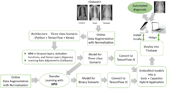 In both cases, HPO was used to optimize hyper-parameters such as dropout probabilities, activation functions (such as ReLU or ELU), and neurons in the dense layer. Additionally, the learning rate was adjusted using callbacks to escape from local optimums. Finally, the proposed models were converted to TensorFlow JS format and embedded locally in a hybrid application (using Ionic and Capacitor), and they were deployed through Firebase to help provide diagnostics at any time.
