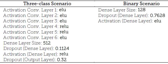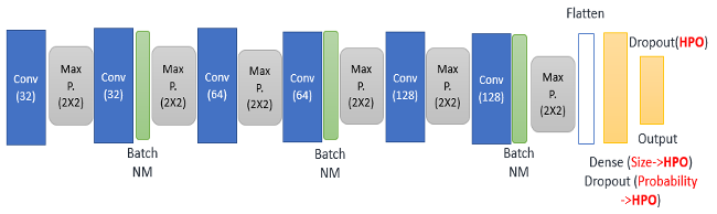 The proposed base architecture is illustrated in Figure 3. The resolution used in the images allowed a maximum of six layers. Therefore, the architecture consists of six convolutional layers with 32, 32, 64, 64, 128, and 128 neurons, respectively. The convolutional layers used 3 x 3 filters and padding to conserve the size of the inputs. This padding allowed to extend the network without having to increase the size of the resolution. Additionally, six max pooling layers with 2x2 windows and no stride (stride 1) were utilized. To improve the optimization of the network, two batch normalization layers were added in the positions illustrated in Figure 2. Additionally, researchers must direct efforts to carefully coping with model design and corresponding hyper-parameter selection. This usually involves high costs, time, and effort. HPO consists of searching for optimum hyper-parameters to be used during the training process. Hyper-parameter refers to parameters that cannot be updated during the training of DL models, such as the structure of the model (layers), layer sizes, activation functions, among others .