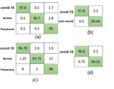 Wang et al. (2020) developed a DL model based on a pre-trained model from ImageNet to achieve an accuracy of 93.3% in the diagnostic of three classes (covid-19, Normal and Pneumonia) but using only 358 covid-19 images and 11.95 million parameters. This model makes heavy use of a lightweight residual projection-expansion projection-extension (PEPX) design pattern. Ioannis & Tzani (2020) developed a DL model using only 224 covid-19 images based on VGG-19 model, obtaining an accuracy of 98.75% and 93.48% in the detection of two and three classes, respectively.