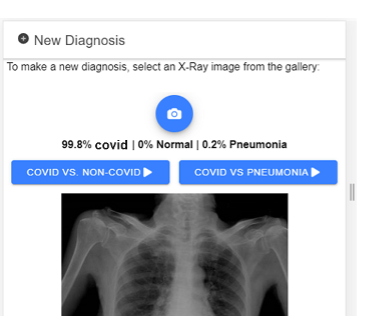 Table 4 shows the selected hyper-parameters using Hyperas and Hyperopt. For the binary classification scenario, the network was adjusted to only 435 617 parameters, while accuracy increased to 98.61% and 99.07% in the validation and testing samples. In the three-class scenario, the network was adjusted to only 879 779 parameters, and the accuracy increased to 96.48% and 93.15% into the validation and testing samples. These network sizes allowed to convert the models to TensorFlow JS format and embed them locally in a hybrid application (using Ionic) that can be installed and executed without the need for Internet access. Additionally, the application was deployed into Internet through Firebase to provide support in diagnostics, without managing infrastructure, saving infrastructure costs, and scaling automatically. Figure 6 presents the proposed application being executed in the three-class scenario. The application supports two languages (English and Spanish) and is available at https://xrays-covid.web.app/.