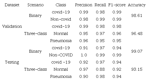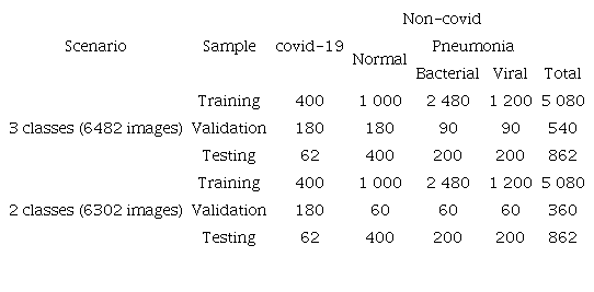 Figure 2 illustrates some sample images used in this investigation. The number of images used for each scenario is presented in Table 1. The three-class scenario (covid-19, Normal and Pneumonia) analyzed a total of 6482 images, 642 for covid-19, 1580 for the Normal class and 4260 for Pneumonia class. Pneumonia class is internally composed of two types (bacterial and viral pneumonia). The two-class scenario (covid-19 and non-covid) analyzed a total of 6302 images, 642 for covid-19, and 5660 for the Non-covidclass (Normal and Pneumonia). The training and test samples use the same amount of data in both scenarios and the testing sample is never seen during the training phase. It should be noted that although the training and testing samples are unbalanced, the size of the validation sample (used during training process) is balanced using 180 images for each class (360 and 540 for 2 and 3 classes, respectively), although this caused a small difference in the total number of images used in both scenarios.