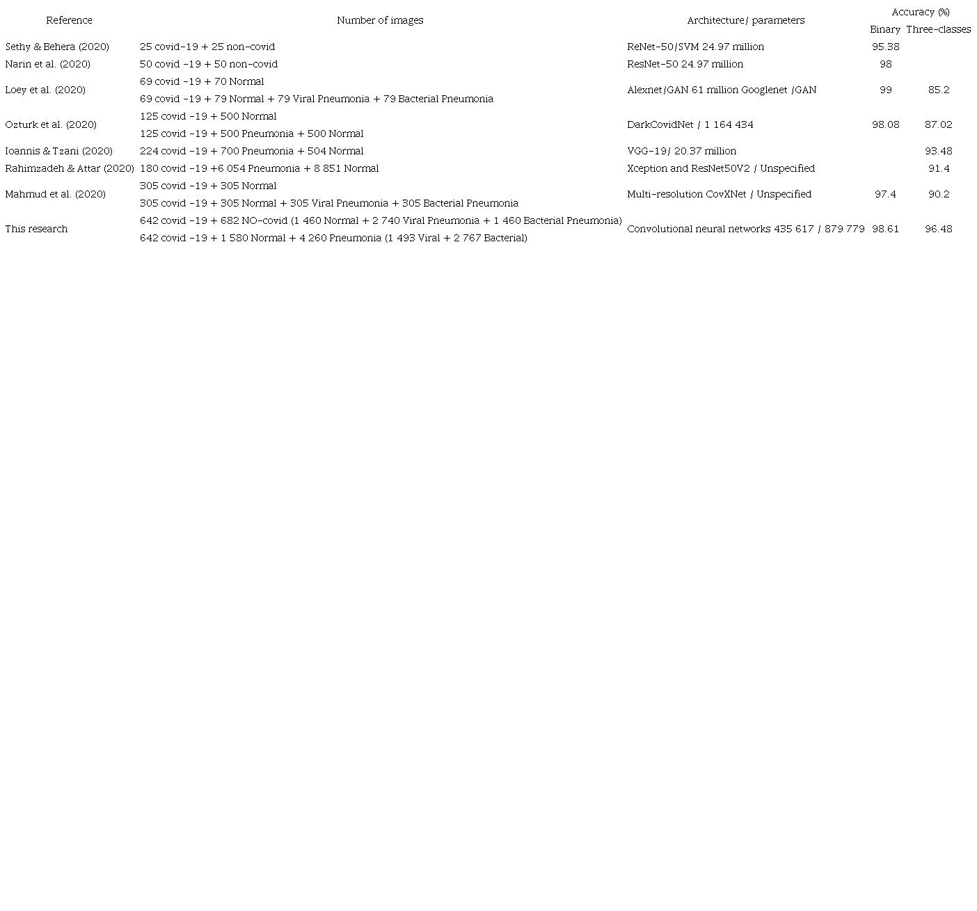 Deep learning (DL) has already been used for image and signal processing in healthcare, improving diagnostics based on medical, multidimensional, or thermal images. Recently, X-ray images and DL models have been used for the detection of covid-19. Loey et al. (2020) used a DL model based on GAN and transfer learning to reach an accuracy of 85.2% in the prediction of three classes (covid-19, Normal and Pneumonia) but using only 69 covid-19 images and 306 total images for all the classes. For transfer learning, AlexNet, GoogleNet, and ResNet were selected in this study. Rahimzadeh & Attar (2020) trained several deep convolutional networks into three classes: normal, pneumonia, and covid-19 using 180 X-ray images belonging to persons infected with covid-19 and an unbalanced dataset (fewer cases of covid-19 along with more cases from other classes). For the networks, they proposed a neural network that is a concatenation of the Xception and ResNet50V2 pre-trained models. The overall average accuracy for all classes was 91.4%.