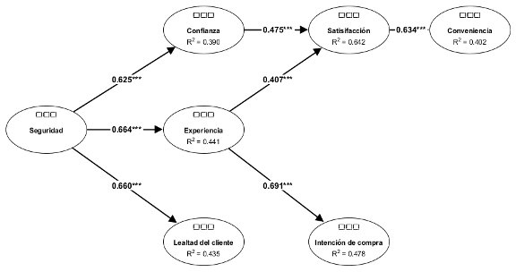 Asimismo, en el modelo propuesto, la lealtad del cliente también se presenta como una variable dependiente y reflexiva, siendo la seguridad la única variable independiente asociada. Por consiguiente, la hipótesis se valida únicamente en la relación que va de la seguridad a la lealtad. Este modelo destaca que las variables conveniencia, intención de compra y lealtad comparten la característica de ser dependientes.