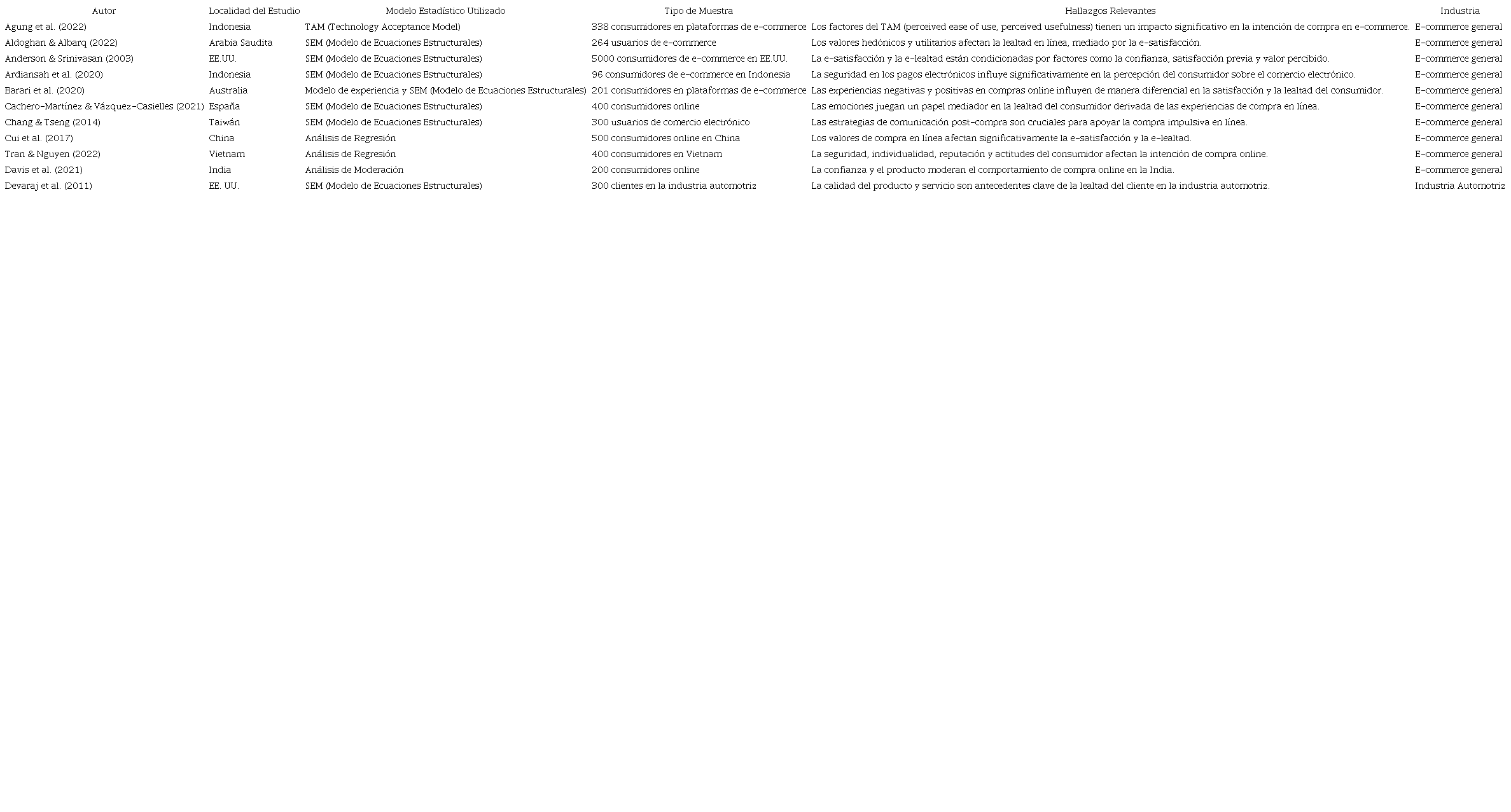 La Tabla 1 sintetiza los modelos estadísticos, tipos de muestra y hallazgos clave de los estudios revisados, proporcionando un análisis integral de las variables que inciden en el comportamiento del consumidor en el contexto del comercio electrónico.