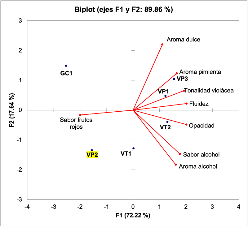 De acuerdo con la Figura 2, que permite visualizar en un Biplot los atributos sensoriales y las muestras de vino (mapa perceptual), se observa que los vinos GC1 y VP2 se caracterizaron por el sabor a frutos rojos, de acuerdo con la dirección de su vector, ubicado al lado izquierdo del componente principal 1. El vino VP3 se identificó con el aroma pimienta, aroma dulce, tonalidad violácea y fluidez; el vino VP1 se describió con los mismos atributos del vino VP3, pero con menor intensidad, de acuerdo con su posición con respecto a los vectores de los atributos previamente mencionados. El vino VT2 se ubicó en el cuadrante inferior derecho, relacionado con el sabor y aroma a alcohol, así como la opacidad. Esta visualización facilita la comprensión global de la información; sin embargo, no muestra un análisis estadístico de la significancia de las diferencias entre los tratamientos para cada descriptor.