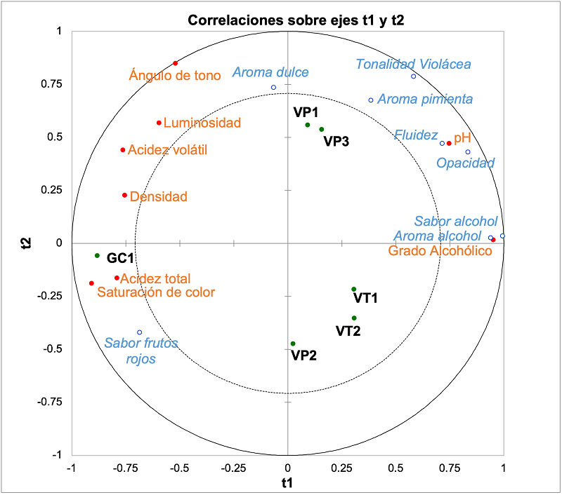 La Figura 3 muestra las correlaciones entre las variables sensoriales y fisicoquímicas de los vinos evaluados, las cuales se ubican cerca de la elipse exterior, indicando que el modelo explica adecuadamente la correlación entre los datos de esas variables (Siebert et al., 2018). El grado alcohólico se relacionó con el aroma y sabor alcohol y fueron ubicados en el lado positivo del componente principal 1; el vino GC1 se ubicó en el lado opuesto del vector de aroma y sabor alcohol debido a que el contenido de alcohol cuantificado y el reportado en la etiqueta fue el menor. Por otra parte, la saturación de color y acidez total se relacionaron con el atributo de sabor a frutos rojos, ubicándose junto con el vino GC1 en el cuadrante que corresponde a los componentes principales uno y dos negativos. Los atributos de fluidez y opacidad se relacionaron con el pH; estas variables, junto con los vinos VP3 y VP1, se localizaron en el cuadrante correspondiente a los componentes principales 1 y 2 positivos (Figura 3).