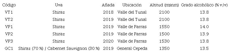 Las muestras utilizadas en este estudio fueron seis vinos mexicanos producidos en la región sur del estado de Coahuila, México, empleando el cultivar de uva Vitis vinífera: “Shiraz”. Los códigos asignados a cada uno de los vinos, la variedad de uva, sus añadas, los grados alcohólicos reportados en etiquetas, y las altitudes y locaciones de las vinícolas se muestran en la Tabla 1. Por otro lado, la Figura 1 muestra las ubicaciones de las cinco vinícolas, en los municipios de Parras y General Cepeda; en una de ellas se adquirieron dos muestras de vino, con diferente proceso de producción. Todos los vinos se producen comercialmente, por lo que en esta investigación no se tuvo control sobre el proceso de elaboración del vino; sin embargo, se verificó que todas las muestras fueran sometidas a fermentación maloláctica y envejecidas en barricas de roble por un periodo aproximado de 12 a 18 meses, con dos a tres años de tiempo de uso. Los vinos se eligieron considerando las recomendaciones de expertos de la industria vinícola de la región evaluada, con el fin de representar a los vinos Shiraz actualmente disponibles en el área de estudio.