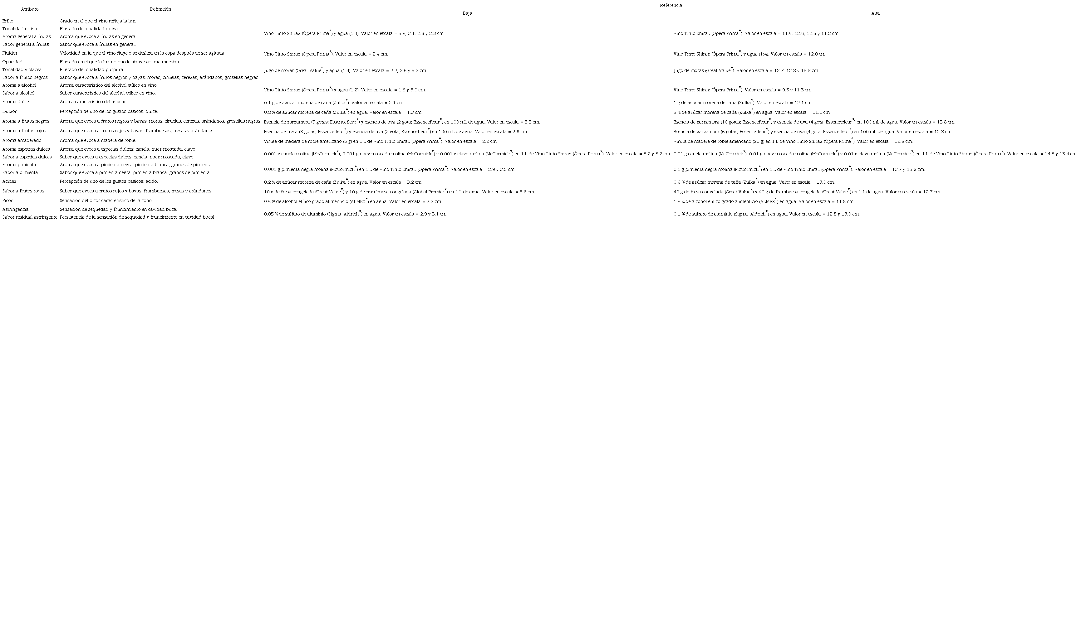 El líder del panel propuso las referencias para cada uno de los atributos que posteriormente fueron validadas por el panel. Sus ubicaciones en las escalas de intervalo de líneas de 15.4 cm de longitud fueron el promedio de las distancias asignadas por los jueces; se establecieron dos anclas a 1.25 cm adentro de las terminaciones de la línea. Los estándares de referencia utilizados para cada atributo evaluado en los vinos tintos Shiraz de Parras, Coahuila, México, se presentan en la Tabla 2.