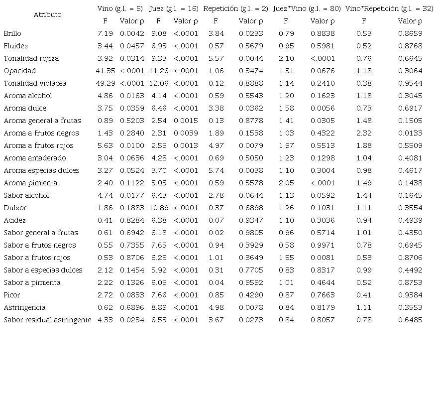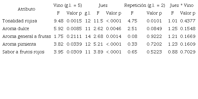 Los jueces presentaron un buen desempeño (reproducibilidad del panel y no existencia de interacción) en 17 de los atributos evaluados, de los cuales nueve no presentaron diferencia significativa entre las muestras de vino. Sin embargo, ocho atributos (cinco iniciales y tres corregidos) no presentaron interacción cruzada, sus repeticiones no fueron significativas y las muestras presentaron diferencia estadística. De estos atributos, tres se relacionaron con la apariencia (fluidez, opacidad, tonalidad violácea), tres con el aroma (alcohol, dulce y pimienta) y dos con el sabor (alcohol y frutos rojos).
