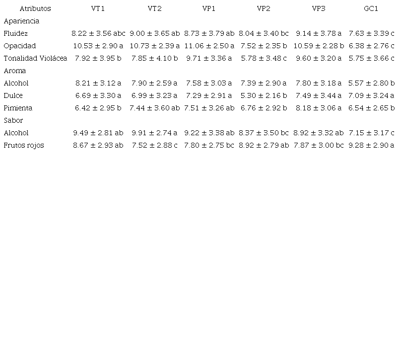 Para el atributo opacidad se formaron tres grupos bien diferenciados. Los vinos que presentaron la mayor opacidad fueron VT1, VT2 y VP1; los vinos VP2 y VP3 presentaron un nivel intermedio y el vino GC1 mostró la menor opacidad. En el atributo de tonalidad violácea se conformaron tres grupos. Los vinos VP1 y VP3 presentaron las mayores intensidades en tonalidad violácea, los vinos VT1 y VT2 formaron uno de los grupos en tonalidad violácea intermedia y los vinos VP2 y GC1 conformaron el tercer grupo con las menores intensidades de tonalidad violácea.