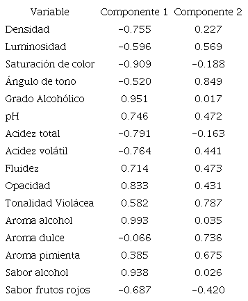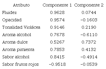 Con los descriptores sensoriales significativos y los vinos se elaboró un mapa perceptual con los resultados de los dos primeros componentes del análisis de componentes principales (Figura 2), los dos primeros componentes explicaron el 89.86% de la variabilidad de los datos. El componente 1 explicó el 72.22% de la variabilidad de los datos; en este componente los descriptores de mayor carga de correlación (mayor importancia de las variables en dicho componente) fueron fluidez, opacidad, tonalidad violácea y sabor a frutos rojos (Tabla 6), el componente 2 explicó el 17.84% de la variabilidad y el descriptor de mayor carga de correlación fue el aroma dulce.