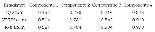 El ajuste del modelo se evaluó empleando los parámetros Q2 acumulada, R²X acumulada y R²Y acumulada. Q2 acumulada es la capacidad de predicción que mide la contribución global de los primeros componentes a la calidad predictiva del modelo. A este respecto, Shmueli et al. (2019) sugirieron que, para evaluar los resultados de una PLSR, el valor de predicción del Q2 debería ser positivo. El índice R²Y acumulada es la suma de los coeficientes de determinación entre las variables dependientes y los primeros componentes; por lo tanto, es una medida del poder explicativo de los primeros componentes de las variables dependientes del modelo. El índice R²X acumulada es la suma de los coeficientes de determinación entre las variables explicativas y los primeros componentes; consecuentemente, es una medida del poder explicativo de los primeros componentes de las variables predictores del modelo (Tenenhaus et al., 2005).