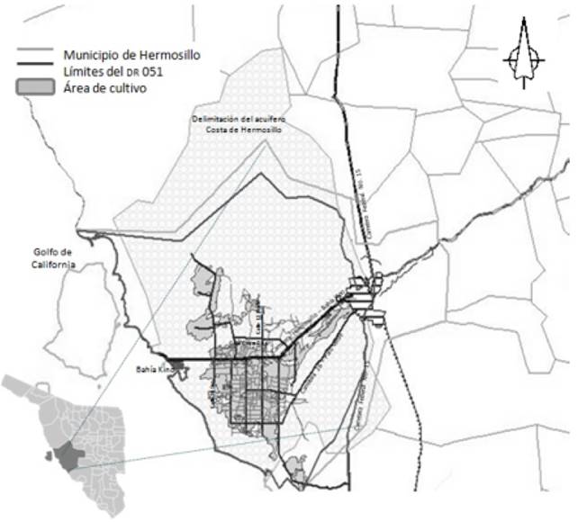 El caso de estudio corresponde al sistema de producción agrícola perteneciente al Distrito de Riego 051 (DR 051) que es abastecido con agua del acuífero Costa de Hermosillo localizado en la costa central de Sonora (Figura 1). Las características naturales de la región corresponden a una planicie costera de ambiente estepario y clima semiárido, donde los recursos hídricos son escasos, pero la combinación y armonización de los recursos naturales de la llanuras favorecen las condiciones para la captación de agua, que al infiltrarse al acuífero, la convierten en un recurso valioso que realza la aptitud del territorio con fines productivos y sociales (Martínez, 2014b:127).