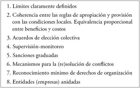 Desde el punto de vista de investigación, los principios de diseño muestran los rasgos relacionados con mecanismos de apropiación, uso y conservación de los RUC, así como de los dispositivos de distribución de costos y beneficios entre los usuarios de los mismos. En la Figura 2, se muestra el listado de los ocho principios de diseño institucional.