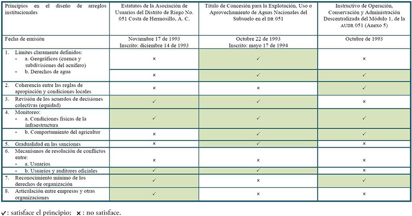 En los tres documentos se establecen directrices, atribuciones y obligaciones para administrar desde el ámbito burocrático y legal el agua subterránea concesionada. En sentido amplio, y desde el punto de vista institucional, los tres documentos génesis de la AUDR 051 son una mezcla de reglas constitucionales y de elección colectiva, con escasas reglas operativas. Es preciso recordar que los ocho principios de diseño institucional orientan a manera de comparación, sí el contenido de las reglas establecidas por un grupo de actores cuentan con características de haber sido formuladas exitosamente (Poteete et al., 2012:199).
