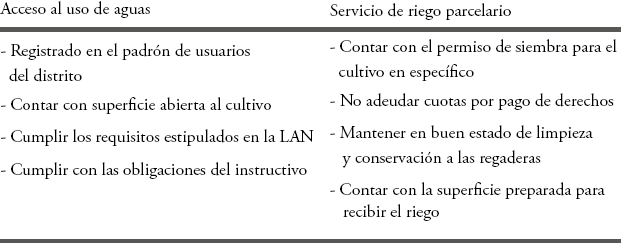 En este sentido, la principal regla de inclusión o de asignación del recurso se establece en el artículo 9: para gozar del derecho al uso de las aguas del distrito debe de estar registrado en el padrón de usuarios del distrito con superficie de derecho a riego abierta al cultivo y satisfacer los requisitos estipulados en la LAN (AUDR y Conagua, 1993:7).