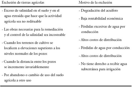 En el artículo 20 del instructivo también se estipulan las áreas agrícolas que, de forma temporal o definitiva, dejarán de recibir agua para irrigar. Los terrenos agrícolas a cancelarse pueden ser propuestos por el usuario a la asociación o bien solicitarse a la Conagua, sin embargo, las áreas descartadas solamente podrán sustituirse por aquellas superficies previamente consideradas en el padrón de usuarios (AUDR y Conagua, 1993:10). Las razones para excluir terrenos agrícolas del riego se muestran en la Figura 5.