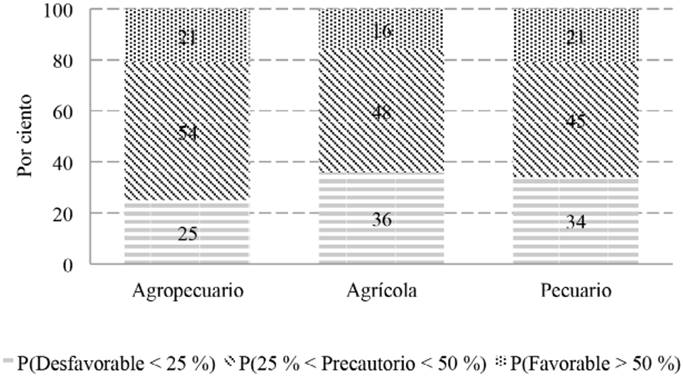 El IN promedio fue desigual entre actividades productivas, entre estratos por actividad y entre estratos de la misma actividad; así mismo, para todos los productores agropecuarios fue 225 247 pesos, agrícolas 362 437 y pecuarios 95 323 pesos. El 21% de los productores agropecuarios tuvo una probabilidad mayor a 50% de obtener un IN positivo, 16% de los agrícolas y 21 % de los pecuarios (Figura 1).