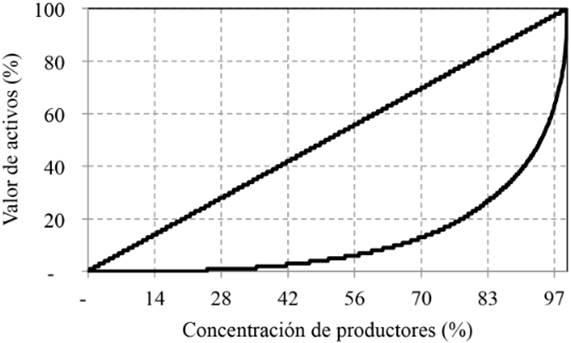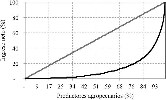 Al considerar el valor de los activos, los productores con AA tuvieron una mayor concentración del ingreso (57%), seguido por AM (33%) y AB (10%). Así mismo, MB registró el más alto grado de concentración (73%), le siguieron MA con 17% y MM con 10%. Al tomar en cuenta el valor de los activos y el grado de marginación, la concentración del ingreso fue desigual. El estrato AA-MB concentró 42% del ingreso neto, AB-MB 23%, y el resto 35%. El CG fue de 74%, lo que significa una baja distribución del ingreso, el Banco Mundial (2011) reportó para México un CG de 47.2% en 2010. El 25% de los productores con ingreso más bajo concentró 1% del ingreso neto, 50% con ingreso más bajo concentró 5%, y 75% solamente concentró 17%; lo que significa que 25% de los productores con ingreso más alto concentró 83% del ingreso neto (Figura 2).