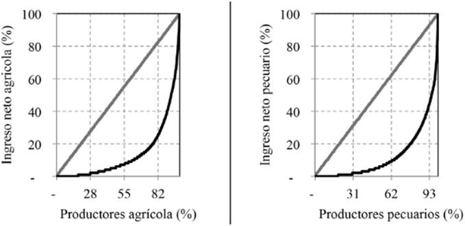 Para medir la distribución del ingreso de los productores agropecuarios, se utilizó el CG. El ingreso agropecuario se obtuvo de la suma de los ingresos agrícolas, pecuarios, forestales, acuacultura y transferencias de gobierno.
